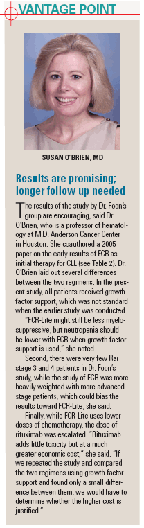 Dr. Foon noted that it is still too early in follow-up to report the impact of FCR-Lite on survival. He also said that the potential benefit of maintenance rituximab as used in this trial will require additional follow-up of progression-free and overall survival. The study population had a higher percentage of Rai stage 1-2 patients (84%), compared with other studies of FCR, which would predict for higher response rates, he pointed out.