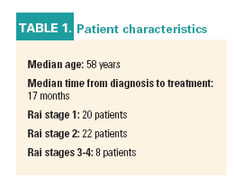 The study enrolled 50 patients (see Table 1), 68% of whom were treated by community oncologists. Patients were pretreated with oral diphenhydramine, oral acetaminophen, and oral or intravenous dexamethasone. Treatment was interrupted for grade 3 and 4 toxicity and resumed at a slower infusion rate when symptoms abated. All patients received prophylaxis with oral trimethoprim-sulfamethoxazole and acyclovir, continued for six months after the last dose of chemotherapy. Filgrastim (Neupogen) or pegfilgrastim (Neulasta) was initiated 24 hours after chemotherapy.