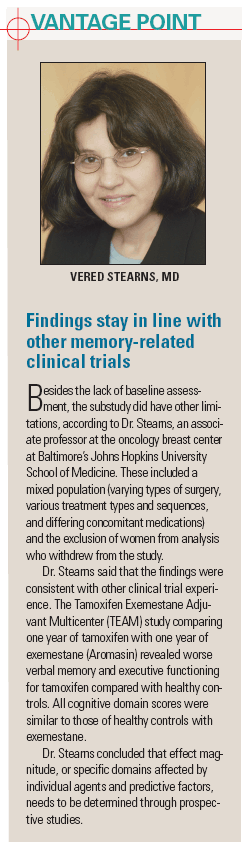 The analysis showed that while each of seven cognitive domain scores favored letrozole numerically, only the visual attention score was significantly higher (P = .05) for letrozole. Letrozole, however, was favored significantly (P = .04) in the composite score, the study’s primary endpoint. Also, while impairment below the norm was found in all domains for both drugs, the proportion of impairment for memory was 25.5% for those receiving tamoxifen and only 6.2% with letrozole (P = .003).