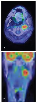 DR. DANIEL BOWLES: The patient was a 46-year-old man who presented to the University of Colorado Cancer Center (UCCC) for evaluation and treatment of a locoregionally recurrent squamous cell carcinoma (SCC) of the left tonsil. SCC was originally diagnosed one year earlier when a left tonsil mass was biopsied and determined to be a poorly differentiated HPV-positive SCC. The patient was a lifelong nonsmoker and drank alcohol rarely. He chose surgery as his primary modality of care and underwent a tonsillectomy and left neck dissection. His primary mass was 3.1 cm x 2.5 cm x 1.3 cm, and 1 of 20 level 2A lymph nodes was positive, with a maximal dimension of 3.5 cm. His cancer was stage IVA (T2 N2a M0) based on the histology and a PET/CT scan that did not show evidence of metastatic disease. Surgical margins were negative, but he had evidence of both angiolymphatic and perineural invasion. Fluorescence in situ hybridization (FISH) was positive for high-risk HPV. He received adjuvant external beam radiation to 60 Gy to the primary tumor site and 54 Gy to the bilateral neck. He did not receive a systemic sensitizing agent. A PET/CT scan 2 months after the completion of adjuvant radiation showed no evidence of disease. However, a PET/CT scan 3 months later revealed a hypermetabolic lesion in the oropharynx within the surgical bed and radiation field. He underwent a salvage oropharyngeal resection with mandibular swing and left radial forearm flap placement. He was again found to have SCC, with an ulcerative mass 2.5 cm in size involving the submucosa and skeletal muscle. Perineural invasion was observed once again. Just 3 months following his salvage surgery he began to experience weight loss, dysphagia, and voice changes. Another PET/CT scan revealed a hypermetabolic mass in the left retropharyngeal/parapharyngeal region. At this time he established care at UCCC to investigate other treatment options.