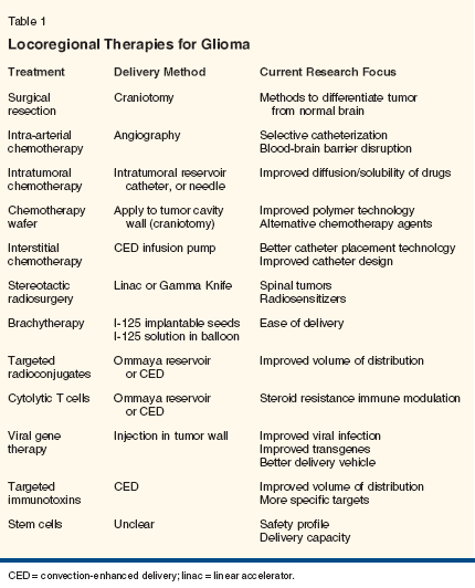 Glioma is the most common form of primary brain tumor, as well asthe most lethal. Primary treatment strategies for glioma, includingcytoreductive surgery, external-beam irradiation, and systemic chemotherapyhave had generally disappointing results for these tumors. Limitationsof these approaches include tumor invasion into functional braintissue, lack of chemosensitivity, and shortcomings of systemic delivery.Recent attention has focused on locoregional strategies for treatment,as well as new methods for delivering therapy. Identification of tumorspecificsurface targets, biologic agents, and more sophisticated meansto deliver macromolecules to the brain is offering new promise in thetreatment of these tumors. This paper will review the current state ofthe art of available locoregional therapies for glioma, with a particularfocus on convection-enhanced delivery, targeted toxin, and other biologicstrategies.