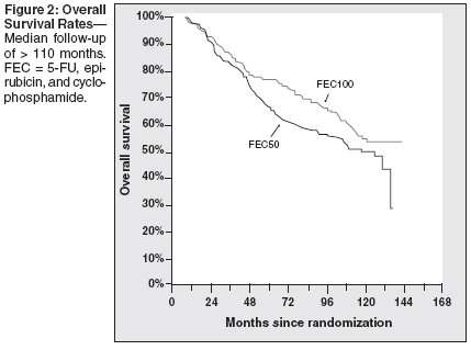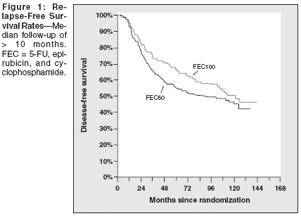 The efficacy of adjuvant chemotherapy has been shown in patients with breast cancer. Furthermore, anthracycline-containing regimens are more effective than non-anthracycline-containing ones.[1] The French Adjuvant Study Group FASG-05 study compared FEC100 and FEC50 (fluorouracil [5-FU]/epirubicin [Ellence]/cyclophosphamide [Cytoxan, Neosar]) in patients with node-positive breast cancer. The main objective of this study was to demonstrate that doubling the epirubicin dose could improve overall survival. The 5-year results[2] have recently been updated to 10 years together with a long-term cardiac and hematologic side effects study[3] and a medicoeconomic study.[4] Clinical Trial Design The main eligibility criteria were female patients younger than 65 years old with histologically proven completely resected breast cancer. All patients had axillary nodal involvement, either more than three positive nodes or between one and three, provided they had no hormone receptors and a histoprognostic grading of II or III. No patients had received prior systemic treatment and all had normal hematologic, hepatic, and cardiac function. A total of 565 patients were randomized between April 1990 and July 1993; 536 were evaluable. No differences were observed in the clinical characteristics of the patients in the two treatment groups. Efficacy Results After a median follow-up of > 110 months, the relapse-free and overall survival rates were higher in those patients receiving FEC100 (P = .03 and .04, respectively); see Figures 1 and 2. At 10 years, the hazard ratios were 1.24 (95% confidence interval [CI] = 1.11-1.36) and 1.29 (95% CI = 1.16- 1.43), respectively. It can be concluded that the 5-year results are maintained at 10 years. The 10-year relapse-free survival rates for the study population were 45.4% ± 3.4 vs 50.7% ± 3.4 for FEC50 and FEC100, respectively (P =.03). The 10-year overall survival rates are very good for a population of patients with such a poor prognosis (50% ±3.3 vs 54.8% ± 3.5 for FEC50 and FEC100, respectively; P =.04 ). Long-Term Side Effects If the short-term side effects in the FEC100 group were more frequent and severe than those in the FEC50 group, they were manageable. Of major concern were the long-term side effects, especially the cardiac toxicity and the risk of leukemia, which could have limited the use of the FEC100 regimen. Cardiac Toxicity
