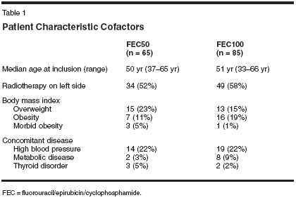 During the first 5 years, 10 cases of cardiac symptoms were observed (6 after FEC50 and 4 after FEC100). In all but two cases (one after FEC50 and one after FEC100), they were observed after retreatment with anthracyclines or anthracenediones at the time of relapse. One patient in the FEC50 group had a myocardial infarction that was considered unrelated to treatment. One patient in the FEC100 group received treatment in spite of a pathologic left ventricular ejection fraction (LVEF) before chemotherapy and should not have been included in the trial. This patient developed congestive heart failure and is still alive, free of disease, but awaiting a heart transplant. Long-Term Cardiac Effects To evaluate the long-term cardiac consequences of epirubicin in patients who had not relapsed (to avoid the interference of a cardiotoxic retreatment) at least 5 years after the end of adjuvant chemotherapy, we carried out a clinical trial in those patients included in the FASG-05 study who had not relapsed and who agreed to a cardiac work-up. Of the 278 patients who were free of disease, 150 could be included. The reasons for noninclusion were as follows: 58 patients refused, 10 relapsed, 15 were lost to follow-up, and 1 died from other causes. In 44 cases, the study was not possible for logistic reasons in some institutions. Cardiac assessment included a clinical visit with a cardiologist, an electrocardiogram, isotopic determination of left ventricular ejection fraction (LVEF), and echocardiography (measurement of LVEF, shortening fraction, telediastolic and telesystolic diameters, isovolumetric relaxation period, and E/ A wave ratio). Patient files showing an abnormality were blindly peer-reviewed by three independent cardiologists who decided whether the cardiotoxicity was related to the adjuvant chemotherapy and whether the side effects were unrelated, possibly related, or probably related according to the associated risk factors. Patient characteristics were the same in both the initial study population (n = 565) and the population included in the cardiac study, as well as in the two groups of the cardiac study (the FEC50 [n = 65] and FEC100 groups [n = 85]). Comorbidities were similar in both groups (Table 1).