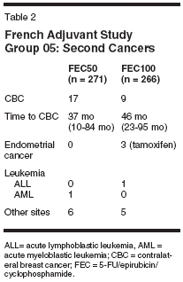 Although the difference was not significant, a contralateral breast cancer has been found less often after FEC100 (9 cases) than after FEC50 (17 cases); see Table 2. Endometrial cancer was observed in three patients receiving tamoxifen (Nolvadex); all patients were in the FEC100 group. The other cancers were found at the same rate in both groups. Ten-Year Event-Free Survival When considering all clinical events, either relapse or long-term side effects, the event-free survival rate was 44.5% in the FEC50 group and 49.3% in the FEC100 group (P = .06). The relative risk of an event was 1.20 (95% CI = 1.08-1.32). Conclusions After a median follow-up of 10 years, the benefit/risk ratio of the FEC100 regimen in patients with positive axillary nodes is strongly positive. Furthermore, a medicoeconomic study showed that the cost per year of life saved was approximately 1,000 euros, which is very low.[4]