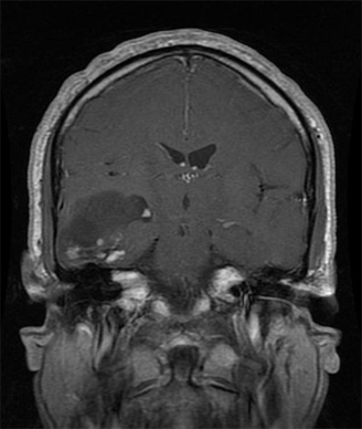 Oligodendroglioma: MRI T1 with gadolinium contrast, coronal section; source: RadsWiki, Wikimedia Commons