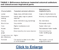 Two types of LTVA devices are available. There are tunneled external catheters that have skin surface access (Hickman, Broviac, Groshong, Quinton). Likewise, there are subcutaneous implanted ports (Port-A-Cath, Infusaport). Both types of central venous access devices are available with different lumen diameters and numbers. Peripherally placed central venous access devices, such as the PAS (peripherally accessed system) port or PICC (peripherally inserted central catheter), have become popular because of their ease of placement. PICC devices can be placed by specially trained nursing personnel. Important differences between tunneled external catheters and subcutaneous implanted ports are outlined in Table 1.