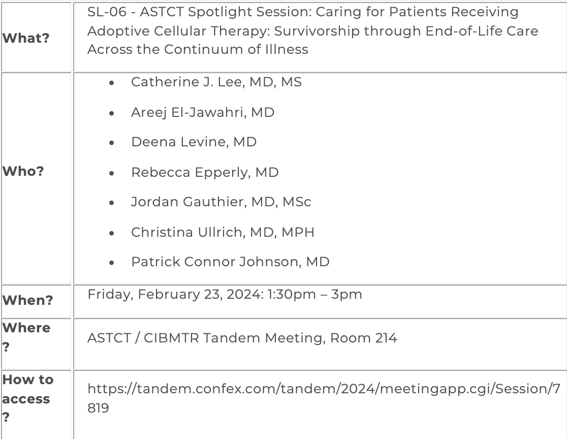 Information on how to access the presentation: SL-06 - ASTCT Spotlight Session: Caring for Patients Receiving Adoptive Cellular Therapy: Survivorship through End-of-Life Care Across the Continuum of Illness