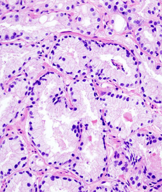 Acinar adenocarcinoma obtained by core needle prostate biopsy; source: KGH, Wikimedia Commons