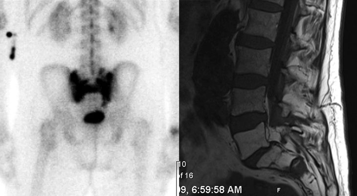 A 70-year-old man with a history of localized prostate cancer treated with whole-pelvis radiation therapy with a boost to the prostate, in conjunction with androgen deprivation therapy 7 years prior, presented with lower back pain. Evaluation by his primary care physician led to a bone scan, which revealed an area of activity in the sacrum. The patient’s prostate-specific antigen (PSA) level has been stable for the last 3 years. He has no other areas of pain and is otherwise healthy.