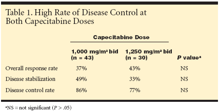 Patients with a partial response or stabledisease had up to six cycles of treatment;patients with complete responsehad an additional two cycles, and patientswith progressive disease were withdrawnfrom the study.A total of 73 patients were enrolled,and the median age of the patients was72.9 years (range 65 to 89). All patientshad measurable or evaluable advanceddisease, Karnofsky performance status≤ 2, and adequate bone marrow, cardiac,renal, and hepatic function.Patients could have had no more thanone prior chemotherapy regimen and/ortwo hormonal regimens for metastaticdisease. A previous therapy containingfluorouracil was allowed but a minimumperiod of 12 months was required startingfrom the last dosage of the previous treatment.The metastatic sites were soft tissue(28), bone (27), liver (26), lung (20), andothers (20). The primary end points werethe safety profile and tolerability, the secondaryend points were response rate andtime to progression.Most Completed Full CourseOverall, 39 patients (53%) completedthe full course of treatment. There was asimilar incidence of premature withdrawalat the two treatment doses, and treatment-related adverse events led to prematurewithdrawal of 13 patients (18%).All patients were evaluable for toxicityand 62 patients for response. Toxicityaccording to National Cancer Institute-Common Toxicity Criteria (NCI-CTC)Bethesda guidelines was: grade 3/4 diarrhea(6%), grade 3 vomiting (7%), grade1/2 hand-foot syndrome (47% in thehigher-dose group and 30% in the lowdosegroup), grade 2/3 asthenia (26%),grade 2 stomatitis (11%). There were twodeaths during the study; one due to treatmentrelated diarrhea/dehydration, andone due to disease progression."There were fewer dose reductions foradverse events required in patients receivingthe lower dose compared with patientsreceiving the higher dose," noted thestudy's lead investigator, Giuseppe Procopio,MD, of Istituto Nazionale per lo Studioe la Cura dei Tumori, Milan, Italy.Considerable Activity"Oral capecitabine demonstrated considerableactivity, achieving a high rate ofdisease control, with no significant differencesbetween the lower and higher dosegroups," Dr. Procopio continued. Diseasecontrol was 86% with the lower dose and77% with the higher dose (see Table 1).Objective responses were documented in36% of patients (26), with 3% completeremission, 32% with stabilization ofdisease, and 18% with progression. Themedian time to disease progression was77 days (range 14-139 days).Dr. Catena reported that the studyfound a favorable safety profile of oralcapecitabine 1,000 mg/m2 twice daily inelderly patients compared to the higherdose. "There was a low incidence of grade3/4 adverse events and no grade 3/4myelosuppression. There was a lower incidenceof grade 3/4 diarrhea (2% vs 13%)and fewer dose reductions (2% vs 30%)compared with oral capecitabine 1,250mg/m2 twice daily."This lower dose regimen is as effectiveand better tolerated than the higher doseregimen and can be recommendedfor elderly patients with locallyadvanced metastatic breast cancer," Dr.Catena concluded.