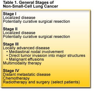 Lung cancer staging is broadly illustrated in Table 1. Stages I and II are localized disease that may be amenable to a potentially curative surgical resection in patients physiologically able to undergo such a procedure. Stage III is locally advanced disease; there are at least three major subsets: those with stage III defined by mediastinal nodal involvement, those defined by direct invasion of tumor into major structures (heart, vertebral body, major vessels), and those defined by malignant effusions. The latter group has now been incorporated into stage IV. Patients with stage III disease, defined by mediastinal nodal involvement or tumor invasion, can be considered for multimodality therapy with potentially curative intent. Stage IV disease is defined by distant metastatic disease. Patients with stage IV disease are primarily managed with chemotherapy (where appropriate) and also may benefit from radiotherapy and surgery in appropriate circumstances. Occasional stage IV patients with solitary metastases (particularly in the brain) may be cured with surgical resection or stereotactic radiotherapy.
