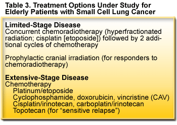 Treatment options under study for elderly patients with SCLC are listed in Table 3. The current standard of care, based upon a randomized phase III intergroup trial, is for patients with limited-stage SCLC to be treated with concurrent chemoradiotherapy followed by 2 additional cycles of chemotherapy.28 Radiation should be hyperfractionated (twice daily) to a total of 45 Gy, with chemotherapy consisting of cisplatin/etoposide. In addition, based upon a meta-analysis of randomized trials, there is a consensus that patients achieving a complete response or a "good" partial response should also receive prophylactic cranial irradiation (PCI).