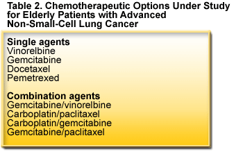 The most robust data regarding therapy in the elderly are in the advanced-disease setting (Table 2). Several randomized trials have demonstrated that single-agent chemotherapy is superior to so-called best supportive care. The ELVIS (Elderly Vinorelbine Italian Study) trial demonstrated superior survival and quality of life in older patients treated with chemotherapy.18 Studies with single-agent gemcitabine (Gemzar) have also demonstrated similar results. A comparison of docetaxel (Taxotere) as a single agent versus vinorelbine showed an advantage for docetaxel in terms of response, progression-free survival, and disease-related symptoms but only a trend toward improved overall survival.19