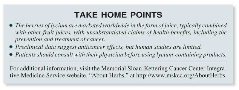 COMMENTS: Lycium has not been subjected to rigorous clinical trials. Despite the lack of substantial scientific evidence, lycium-containing juices are marketed as cancer cures. Many brands do not indicate the amount of lycium present in the products.