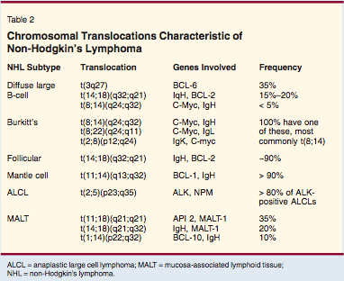 The use of genetic studies to diagnose non-Hodgkin's lymphomas is becoming increasingly important. Several genetic abnormalities (that are characteristic of specific subtypes of non-Hodgkin's lymphoma) might be identified by cytogenetics or by fluorescence in situ hybridization (FISH) studies, which can resolve diagnostic dilemmas (Table 2). In addition, gene array studies have shown the potential for improving diagnostic accuracy. For example, Dave and colleagues have shown that difficulties in distinguishing between diffuse large B-cell lymphoma and Burkitt's lymphoma can be accurately resolved by the use of gene arrays.[18] It is likely that gene array studies will become commercially available in the future and make an important contribution to our ability to diagnose patients with non-Hodgkin's lymphoma.