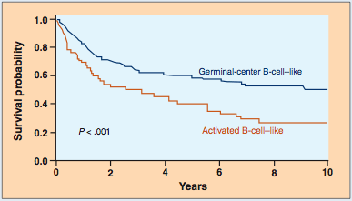 Figure 1: Overall Survival According to Risk Group--Note difference in survival for patients with a diffuse large B-cell lymphoma that had a gene expression pattern similar to normal germinal center B-cells vs those whose tumors expressed genes similar to activated B cells. Adapted from Rosenwald A et al.[16]