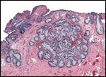 Dr. La Rosa: The extent of cystitis glandularis in this case appears to correlate with the duration of urinary stasis. Diverting the urine, but leaving the bladder in place likely produced recurrent infection of the urinary bladder due to inadequate drainage. Lin et al postulate that the intensity of the infection may be responsible for the development of adenocarcinoma in such circumstances.[2] Cystitis glandularis, especially the diffuse type, can undergo malignant degeneration under constant irritation, but this is a rare and long-term process.