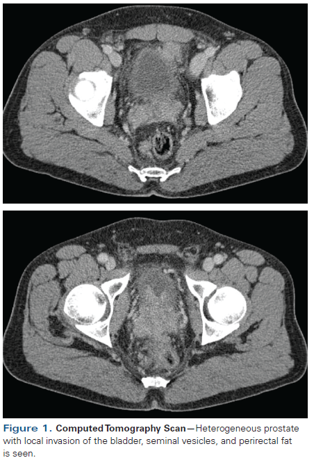 A 55-year-old Hispanic male presents with a family history of gastric cancer in one sibling and prostate cancer in an older brother. CT performed in March 2015 for IMT surveillance showed a heterogeneous prostate with local invasion involving the bladder, seminal vesicles, and perirectal fat.