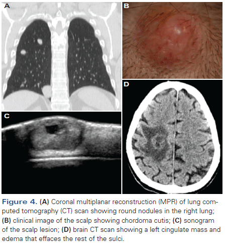 When the patient presented a year after completion of adjuvant radiation therapy (following resection of the tumor on his left thigh), a CT scan documented pulmonary metastases (Figure 4A). Because imatinib is the targeted therapy that has shown the most promise to date in advanced chordoma-and because only tumors positive for PDGFRβ (Answer A) have demonstrated a response to this agent-immunohistochemistry for PDGFRβ was performed. Results of the immunohistochemistry investigation for PDGFRβ in tumor tissue were negative. Therefore, he unfortunately was not considered a candidate for imatinib therapy. He subsequently developed a scalp lesion (chordoma cutis; Figure 4B & 4C) and a mass in the antecubital region of his left arm. A low-back necrotic skin ulcer appeared that also was attributed to chordoma progression; his pulmonary metastases and vertebral lesions showed progression as well. The patient’s clinical course was further complicated by vertebral osteomyelitis. Finally, he developed central nervous system metastases (Figure 4D) and was referred to palliative care and end-of-life support.
