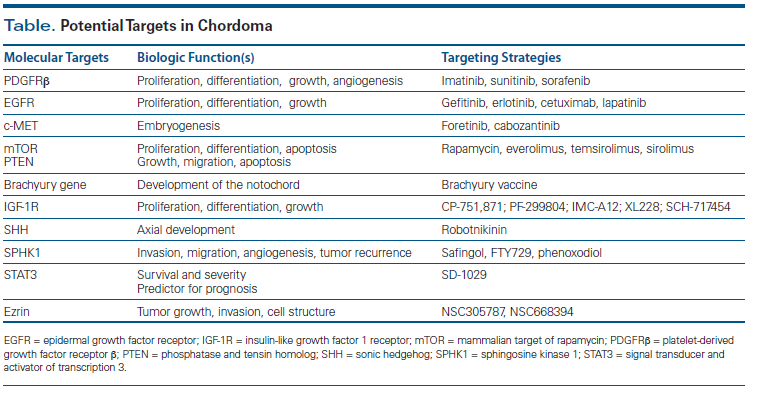 Because of chordoma’s chemoresistance, systemic treatment has focused on other strategies, such as molecular targeted therapy. Potential targets in the treatment of advanced chordoma are summarized in the Table. Protein tyrosine kinases (TKs) mediate phosphorylation of tyrosine residues and play a crucial role in cancer development; mutations in the related genes and overexpression of some of these TKs (eg, PDGFRβ, EGFR, c-MET, human epidermal growth factor receptor 2 [HER2]) are attractive targets for therapeutic intervention.