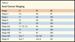 Anal cancer metastasizes via the lymphatic system and less often by hematogenous spread. The distal anal canal below the dentate line drains into the inguinal and femoral lymph nodes, whereas the proximal anal canal drains into the perirectal lymph node. The staging of anal cancer is summarized in Table 2.