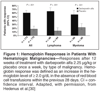 30. Hedenus M, Adriansson M, San Miguel J, et al: Efficacy and safety of darbepoetin alfa in anaemic patients with lymphoproliferative malignancies: A randomized, double-blind, placebo-controlled study. Br J Haematol 122:394-403, 2003.