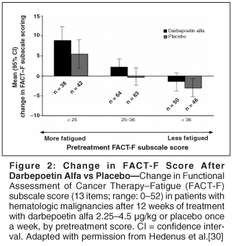 Treatment with darbepoetin alfa was associated with the greatest improvements in FACT-F scores compared to placebo among patients with low baseline values. However, even after adjustment for pretreatment values, improvements in FACT-F scores were significantly greater with darbepoetin alfa than with placebo (P = .03). Moreover, darbepoetin alfa was associated with greater improvements in FACT-F scores than placebo regardless of patients' level of fatigue before treatment (Figure 2). Improvements in FACT-F scores were correlated with increases in hemoglobin (P < .001).