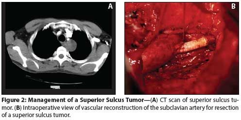 Superior sulcus tumors are centered at the thoracic inlet and include the special category of Pancoast tumors. The classic description of a Pancoast tumor is that of a tumor arising from the lung apex and invading the costovertebral groove in the posterior thoracic inlet. Invasion of local structures gives rise to the symptoms of Pancoast syndrome, which include Horner’s syndrome (ptosis and miosis from invasion of the stellate ganglion) and left shoulder and arm pain with atrophy of the intrinsic muscles of the hand (from involvement of the C8 and T1 nerve roots of the brachial plexus). Although previously considered unresectable, surgical resection can be performed via a posterior approach[5] or an anterior approach popularized by Dartevelle.[51] Preoperative assessment of the subclavian vessels can be challenging, even with the use of MRI (Figure 2A). In the setting of subclavian involvement, however, the vein can often be ligated and the artery can be managed with segmental resection or carotid subclavian bypass (Figure 2B). Unequivocal involvement of the brachial plexus above T1, carotid, or vertebral arteries is generally considered a contraindication for resection.