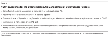 Based on the considerations exposed in this article, the National Cancer Center Network has issued a number of guidelines for the safe management of older persons with cytotoxic chemotherapy[45] (Table 3). Prophylactic use of filgrastim or pegfilgrastim in patients 65 and older receiving chemotherapy with a dose intensity comparable to CHOP has been endorsed also by the guidelines of the American Society of Clinical Oncology[46] and the European Organisation for Research and Treatment of Cancer.[47]