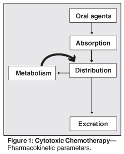 It is reasonable to expect that with age, the pharmacokinetics of cytotoxic chemotherapy may be altered and the risk of some forms of toxicity enhanced.[14] Of the pharmacokinetic parameters illustrated in Figure 1, renal excretion of drugs is almost universally reduced, as age is associated with a progressive decline in glomerular filtration rate. Failure to adjust the doses of drugs to the glomerular filtration rate may be associated with increased risk of therapeutic complications. The volume of distribution of hydrosoluble drugs declines with age due to reduced total body water, reduced concentration of albumin in the serum, and reduced red blood cell mass. This decline may also be associated with increased toxicity due to increased concentration of drugs in the circulation. Of the components of volume of distribution, only the red blood cell mass may be corrected by medical intervention. While the hepatic uptake and metabolism of drugs become progressively more limited with age, the implications of this change have not been completely understood due to the difficulty of studying hepatic pharmacology in the clinical setting.