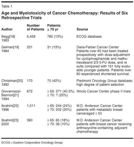 According to six retrospective studies (Table 1), the risk of myelotoxicity did not increase with the patients' age.[18-23] These findings demonstrate that chemotherapy may be safely administered to some persons over 70, but do not answer the question of whether age is a risk factor for chemotherapy-related myelotoxicity. The population involved in the studies was highly selected according to the exacting eligibility criteria of clinical trials. Virtually no patient was older than 80. In addition, further review of the experience of the Eastern Cooperative Oncology Group revealed that the toxicity of methotrexate, nitrosourea, and doxorubicin was increased in persons 70 and over.[18]