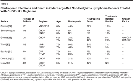 In their analysis of patients in the community treated with adjuvant chemotherapy for breast cancer or with CHOP (cyclosphosphamide, doxorubicin HCl, vincristine [Oncovin], prednisone) for non-Hodgkin's lymphoma, Lyman et al found that as many as 60% of individuals aged 65 and over received suboptimal dose intensity of chemotherapy.[9] A recent meta-analysis of all randomized controlled studies of granulocyte colony-stimulating factor use (G-CSF; filgrastim [Neupogen] and lenograstim [Granocyte]) in the management of lymphoma and solid tumors is of particular concern to our discussion. The authors demonstrated that patients not receiving primary prophylaxis with growth factors experienced a significant increase in neutropenia-related deaths. Most of the deaths occurred in individuals 65 and older.[10]