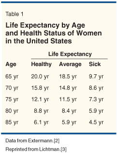The population of patients over 65 years old is rapidly expanding due to a significantly improving life expectancy globally. Since cancer disproportionately strikes this age group, oncologists, whether community-based or academically oriented, will face a growing population of geriatric cancer patients. Among those affected, colorectal cancer is the second leading cause of cancer-related death, with a median age at diagnosis of approximately 72 years.[1] Life expectancy among older individuals is considerable, as shown for US women in Table 1.[2,3] A 75-year-old woman, for example, has a life expectancy of 12 years if she is healthy and would have a life expectancy of 7 years even if she had significant illness. Therefore, issues concerning adjuvant therapy, prolongation of the disease-free interval, and chronic toxicity are also important for the elderly.
