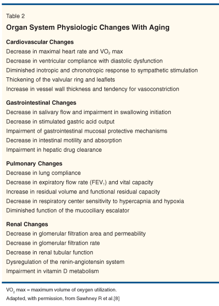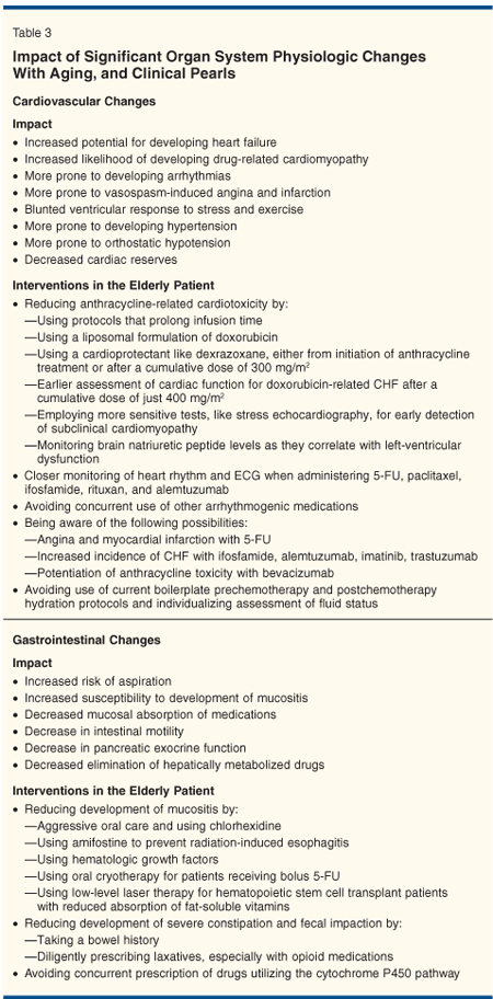 Before discussing chemotherapeutic options, the first step in evaluating older colorectal cancer patients is to better understand the physiologic aging process and its impact on chemotherapy and its toxicity. This diminution of functional reserve or capacity assumes great clinical significance when the organ system is being challenged by cancer and its treatment. The loss of functional reserve is often quite variable during aging. It is also difficult to predict the individual patient's tolerance of cancer treatment. Physiologic changes in functional reserve affect not only the choice of chemotherapeutic agent, but more importantly, the tolerance of side effects of therapy. These physiologic changes can involve all systems and organs (Tables 2 and 3).[8]