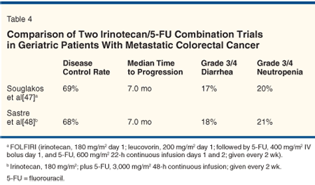 Similar data were seen in the results published by Sastre et al in 2005, evaluating efficacy and safety profiles in 86 patients over 72 years of age.[49] These patients were treated with irinotecan at 180 mg/m2 followed by 5-FU at 3,000 mg/m2 in a 48-hour continuous infusion. The two drugs were given every 2 weeks. A total of 68% of patients obtained disease control, and the median duration of response was 7.0 months (95% CI = 4.2-9.9 months). Grade 3/4 neutropenia and diarrhea were seen in 21% and 18% of patients, respectively. Two deaths were reported; one died of grade 4 diarrhea resulting in renal failure, and the other died of intestinal hemorrhage. The data from these two trials suggest that irinotecan in combination with 5-FU may be a feasible regimen for geriatric patients (Table 4). Diarrhea remains the most threatening side effect.