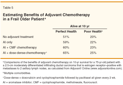 Frail elders with hormone receptor–positive breast cancers are only likely to benefit from adjuvant endocrine therapy with either tamoxifen or AIs if they have an extremely high risk of relapse within a 5-year period. Estimates of the benefits of treatment can be made using the Web-based program Adjuvant! Online (www.adjuvantonline.com). This program factors in the US census–derived mortality data by age, and one can add an estimate of comorbidity to the program to factor in the effect of coexisting illness on treatment benefit. An example of how this can help in treatment selection is shown in Table 5. This example shows that endocrine treatment is likely to be of minimal to no value in improving survival in most frail elders, whose survival would likely be even worse without treatment than that of the patient with poor health used in this example. Moreover, the effectiveness of more intensive chemotherapy (for example, the dose-dense therapy described in this table) when added to endocrine therapy is likely overestimated in this program.