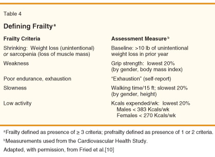 Criteria for defining frailty among the general population have been developed. Clinical criteria for frailty were adapted by the National Institute of Aging and the American Geriatric Society Expert Consensus in 2004.[34] Using data from the Cardiovascular Health Study, a phenotype of frailty was operationalized.[10] Individuals with 3 or more criteria were determined to be frail, and those with 1 to 2 criteria were considered prefrail (Table 4). At 3 years, the mortality rate was 18% for frail patients and 3% for the nonfrail. The prevalence of frailty increased with age and was greater in women than men. Compared to fit older subjects, those who were moderately or severely frail had an eightfold higher risk of institutionalization (relative risk [RR] = 8.6) and a sevenfold increased risk of death (RR = 7.3). Individuals defined as frail had a higher incidence of hospitalization and falls, progressive decline in the ability to complete ADLs, and decreased mobility. Those considered prefrail were at increased risk of becoming frail.