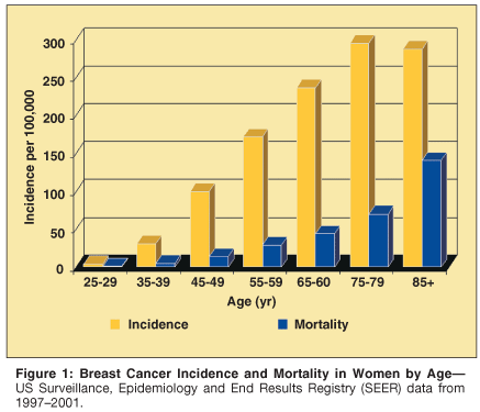 Breast cancer is a disease of aging, and its incidence increases with age (Figure 1). Approximately 1 in 125 women between the ages of 65 and 85 will develop breast cancer each year, as compared to 1 out of 390 women between the ages if 45 and 55.[3] Given the increasing incidence of breast cancer with age and an increasing proportion of the US population over age 65, oncologists will be caring for an ever-larger number of elderly patients.