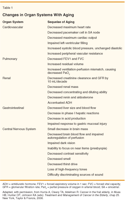 Although the aging process is heterogeneous, universal physiologic changes described in Table 1 occur and can lead in time to decreased physiologic reserve in cardiac, respiratory, and renal function.[16] Several neurologic changes also occur with aging, including decreased vision and neuropathy. Decrease in hematopoietic reserve and impaired immunosurveillance with aging may also influence tolerance of systemic cancer therapy. As a whole, these changes contribute to an increased risk for chemotherapy-associated side effects and death in older patients.[17,18]