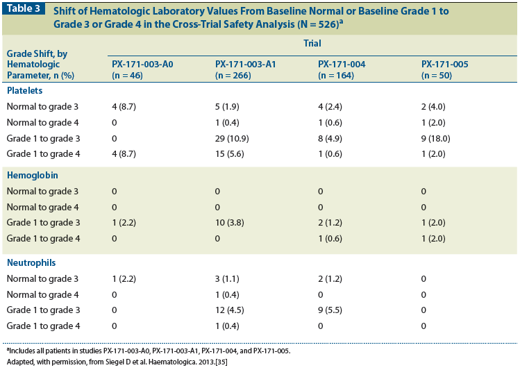 Approximately one-half (46.8%) of patients in the cross-trial safety analysis reported anemia of any grade, which usually presented as grade 1/2 (see Table 2). However, patients in the PX-171-004 study had fewer previous therapies (median of 2, range 1–13), and anemia AEs were less frequent (39.6%) in this study.