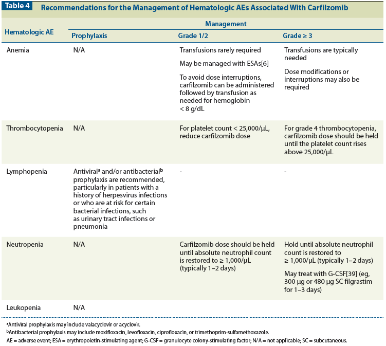 Table 4: Recommendations for the Management of Hematologic AEs Associated With Carfilzomib