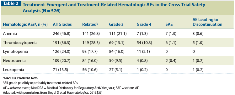 Table 2: Treatment-Emergent and Treatment-Related Hematologic AEs in the Cross-Trial Safety Analysis (N = 526)