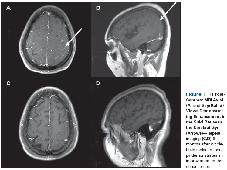 A 40-year-old woman with a history of stage IV carcinoma of the breast with diffuse bony metastases (ypT4N3M1, infiltrating ductal carcinoma, grade 2, estrogen/progesterone receptor–positive, human epidermal growth factor receptor 2 [HER2]–negative at diagnosis) was treated with mastectomy, hormone therapy, and RT. Three years after her initial cancer diagnosis, she developed complex partial seizures (episodes of left head deviation, speech arrest, and staring lasting 1 to 2 minutes) and confusion. Her neurologic exam did not demonstrate any new focal deficit, but the patient did acknowledge shooting pains with neck flexion. Seizures were treated with the non–enzyme-inducing anti-epileptic medications (AED) levetiracetam and lacosamide. A brain MRI demonstrated ventriculomegaly and enhancement within sulci along both the frontal and parietal lobes (Figure 2). CSF cytology demonstrated metastatic cells, and a diagnosis of leptomeningeal carcinomatosis was made.
