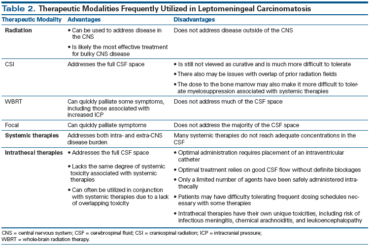 Table 2. Therapeutic Modalities Frequently Utilized in Leptomeningeal Carcinomatosis