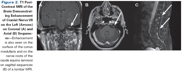 The localizable symptoms relate to the specific neuroanatomy involved. The presence of symptoms that localize to multiple nonconfluent areas in the nervous system should raise the suspicion of a pathologic process within the CSF, which bathes the surface of the entire CNS. Symptoms can be broadly divided into two categories: intracranial and spinal. Intracranial symptomatology most commonly arises from dysfunction of cranial nerves. This can cause extraocular movement deficits leading to binocular diplopia, which resolves with single eye closure. Motor and sensory facial deficits can also develop. The sensory symptoms would be anterior to the ear, limited to the distribution of the fifth cranial nerve. The facial weakness would most likely involve the forehead in addition to the lower face, clinically resembling Bell’s palsy. Clinicians must pay careful attention to the patient’s history, and findings on the physical examination may alter one’s suspicion of leptomeningeal carcinomatosis as the underlying etiology for facial weakness. In the case described here, the known history of stage IV lung cancer should raise concern for leptomeningeal carcinomatosis as the underlying etiology of the patient’s initial facial weakness. Spinal symptomatology can manifest as weakness, due to involvement of the motor nerve roots. There may also be a loss of sensation, but more often radicular pain that radiates along a dermatomal distribution is observed. Cauda equina syndrome is another common presentation of leptomeningeal carcinomatosis. This involves sensory loss in a saddle distribution, radicular pain of the lower extremities, bladder incontinence, and constipation. In comparison to conus medullaris syndrome, which involves the lower portion of the spinal cord parenchyma, cauda equina syndromes are more likely to have asymmetric presentations and radicular pain. Electromyography and nerve conduction studies often reveal an axonal pattern of injury, as was noted in Clinical Vignette #1. This differs from immune-mediated processes, where a demyelinating pattern would more likely be expected. Once the diagnosis of leptomeningeal carcinomatosis is established, prognosis is poor and clinical deterioration can progress rapidly.