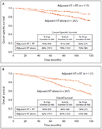Kaplan-Meier Estimates of Cancer-Specific Survival (A) and Overall Survival (B) After Surgery
