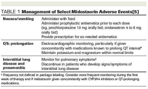 Additional safety concerns reported with midostaurin include QTc prolongation, which was higher in patients receiving midostaurin vs placebo, with elevations >480 ms and >500 ms occurring in 10.1% vs 5.7% and 6.2% vs 2.6% of patients, respectively. Pneumonitis and interstitial lung disease, including some fatal cases, have been reported in patients receiving midostaurin as a single agent or in combination with chemotherapy.[5] Monitoring recommendations are summarized in Table 1.