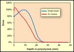 On treatment day 1, the anteroposterior, right posterior oblique, and left posterior oblique positions are treated. On treatment day 2, the posterior, right anterior oblique, and left anterior oblique positions are treated with the same dose. Over the course of a 48-hour treatment cycle, a patient will receive 2 Gy to the entire skin surface. This pattern continues, with patients receiving treatment 4 days a week for a total of 9 weeks, thereby delivering a total dose of 36 Gy to the skin surface. The depth-dose curves for both a single beam and all six beams are presented in Figure 2, which illustrates how this treatment arrangement satisfies the guidelines for skin dose and soft-tissue dose established by the Cutaneous Lymphoma Project Group.