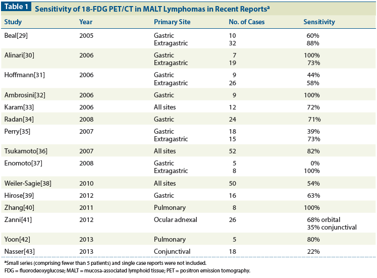 Table 1: Sensitivity of 18-FDG PET/CT in MALT Lymphomas in Recent Reports