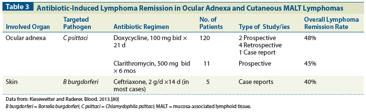 81. Kim TM, Kim KH, Lee MJ, et al. First-line therapy with doxycycline in ocular adnexal mucosa-associated lymphoid tissue lymphoma: a retrospective analysis of clinical predictors. Cancer Sci. 2010;101:1199-203.â©82. Govi S, Dognini GP, Licata G, et al. Six-month oral clarithromycin regimen is safe and active in extranodal marginal zone B-cell lymphomas: final results of a single-centre phase II trial. Br J Haematol. 2010;150:226-9.